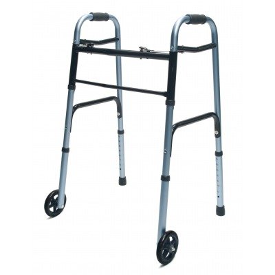 716270R-1 Color: Red Features: -Adult walker.-Sturdy 1" aluminum tubing provides maximum strength while remaining lightweight.-Dual-release folding mechanism enables user to fold walker sides independently.-5" Front fixed wheels.-Complete with glide tips that replace rear leg rubber tips to enhance walker maneuverability on all surfaces.-Designed to meet the requirements of HCPCS code: E0143.-Width inside handgrips: 17".-Width inside rear legs: 20".-Depth when folded: 4".-Weight capacity: 300 lbs. Warranty: -Manufacturer provides one year limited warranty.