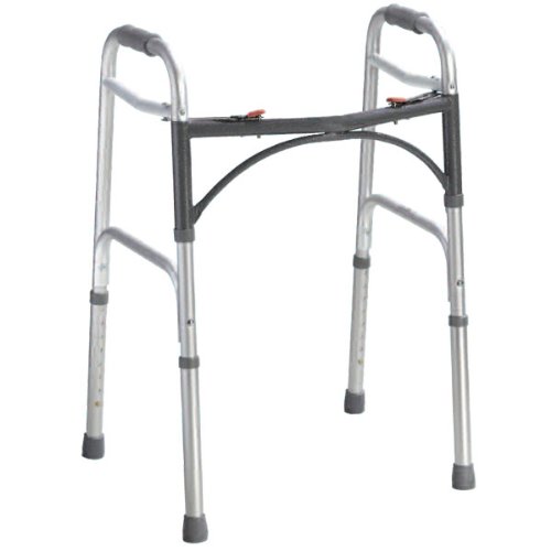 Getting around using a walker has never been easier, more convenient, or more comfortable! This Deluxe Folding Walker offers easy-to-use dual buttons for improved navigation in tight spaces and a unique U-shape frame design that creates more clearance and allows for greater stability. Note: This adult size walker has a increased height range designed to accommodate taller individuals BENEFITS & FEATURES: - Easy push-button mechanisms may be operated by fingers, palms or side of hand - Each side operates independently to allow easy movement through narrow spaces and greater stability while standing - Unique U-shape frame design creates greater clearance - The patient is able to bring the walker closer to assist in standing - Sturdy 1-in. diameter anodized, extruded aluminum construction ensures maximum strength while remaining lightweight - Vinyl contoured hand grip - Limited Lifetime Warranty TECHNICAL SPECIFICATIONS: - Width (inside hand grip): 17 in. - Width (inside back legs): 19 in. - Overall Width: 21.75 in. - Depth (opened at base): 16.5 in. - Height (highest setting): 39 in. - Height (lowest setting): 32 in. - Product Weight: 6.5 lbs. - Weight Limit: 350 lbs.Read more Deluxe Folding Walker Two Button Adult Grey